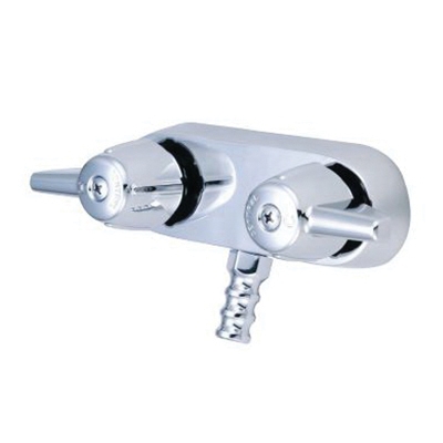 The leg tub fitting has a cast brass body with replaceable seats. The fitting body and spout are polished and chrome plated. The outlet spout is designed for a push on hose connection. The spout fits hose with a 1/2 in ID. The compression stems are all brass with a double O-ring seal and rubber seat washer. The canopy handles are zinc die cast with a chrome plated finish.