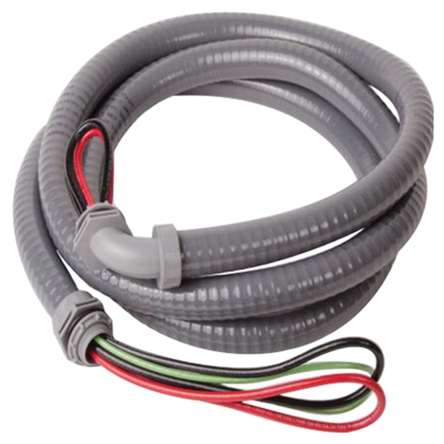 Liquid-tight flexible conduit system. A labor saving convenience kit for A/C unit hookup. Also use for heat pumps, refrigeration, hot tubs, swimming pools and outdoor lighting. 3-distinct wire colors for ease of hook-up. 1-straight and (1) 90 deg metallic or non-metallic connector. 90 deg connector is removable for straight connections.