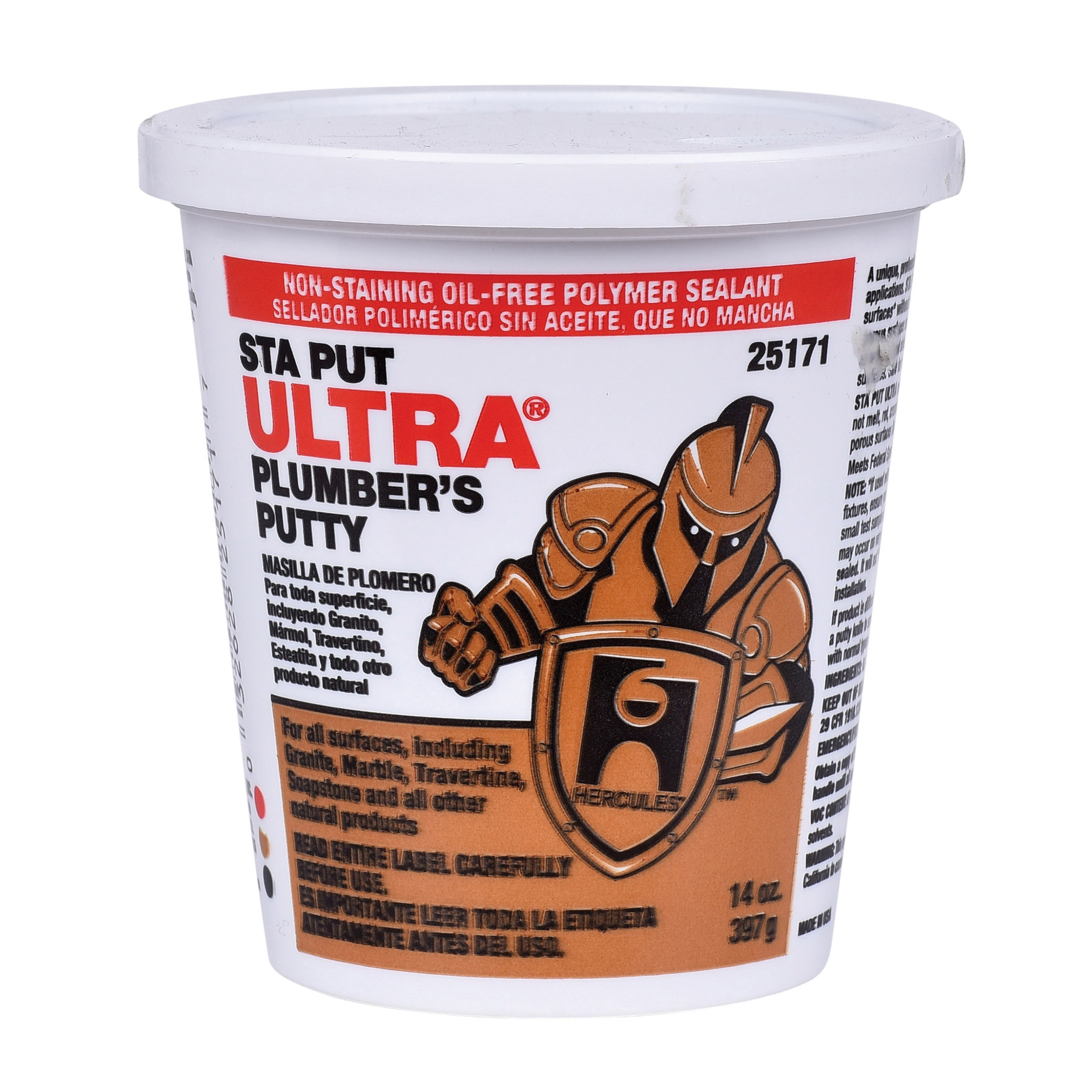 Sta Put Ultra is a unique, professional grade stain-free polymer sealant that is safe for use in setting most types of plumbing fixtures and surfaces. Unlike all other plumber's putty it is oil-free and can be used on porous surfaces without pretreatment. This includes natural, porous surfaces such as stone, marble, granite, plastics, rubber and fiberglass, as well as grout and on manufactured sinks, shower bases, countertops and other surfaces. Sta Put Ultra can be used and handled just like plumbers putty. It can easily be molded into rings or other shapes to conform to the item being installed and remains permanently soft, malleable and flexible. Sta Put Ultra is clean to handle, odorless and non-toxic. It has excellent tack and adheres well to most types of dry surfaces even in vertical positions. Sta Put Ultra does not melt, rot, crumble, dry out or shrink even when used in contact with porous surfaces like wood or concrete.