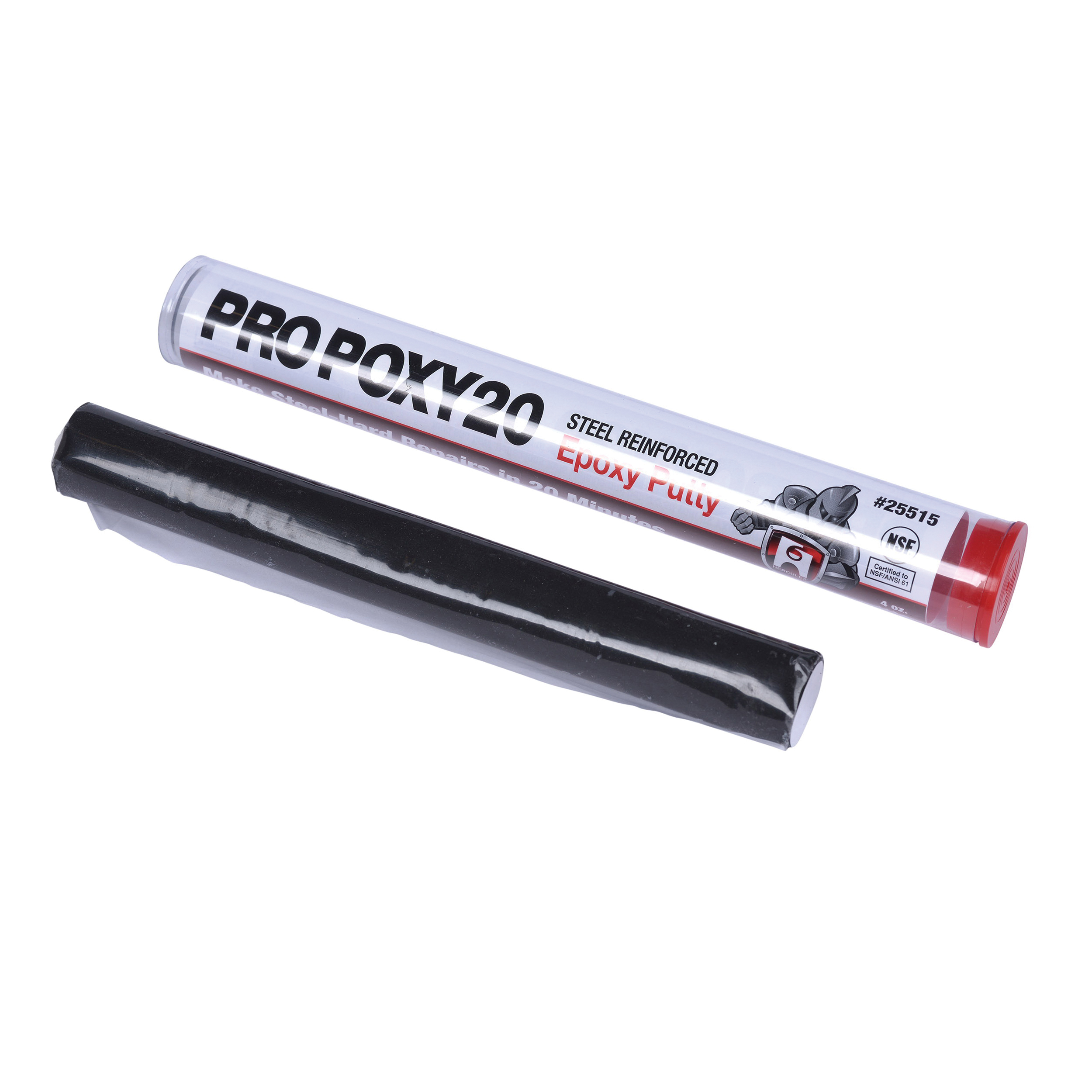 Propoxy 20 is a fast acting, co-extruded single stick, epoxy putty. Made of a pre-measured, steel reinforced dark gray/black epoxy resin with a contrasting strip of hardener embedded in the center. The two part epoxy compound mixes quickly and easily to form a permanent steel-hard bond in 20 min. Adheres to almost any surface with strength often greater than the materials it has joined. After curing, it can be drilled, filed, sanded, painted and machined. Can be applied to damp or wet surfaces and even makes underwater repairs. Propoxy 20 is non-conductive and may be used for electrical insulating repairs and can be used on applications where it is subject to temperatures up to 300 deg F for extended periods of time. Do not expose to open flame.