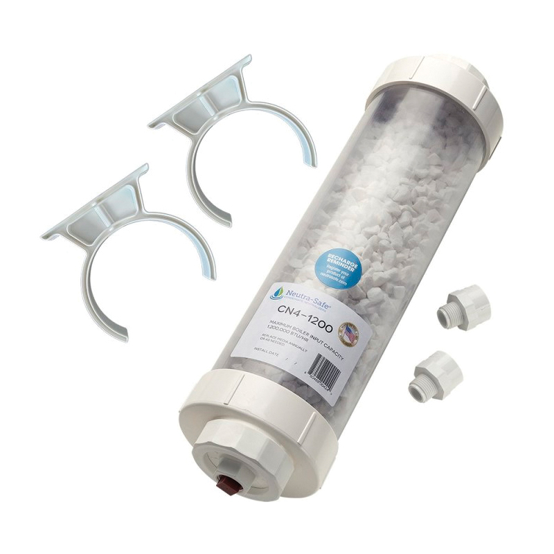 Neutra-Safe tube-style condensate neutralizers come in a range of six sizes from 220000 - 2 mbh/hr. The patented tube-style neutralizers feature integral unions with O-ring seals that greatly simplify removal for service and recharging. Unthreading a lock ring on either end of the unit allows the main body to be removed without disturbing the drain line. Replacement O-rings are included with tube style recharge kits and all 2 in tube-style neutralizers have snap-in mounting brackets.