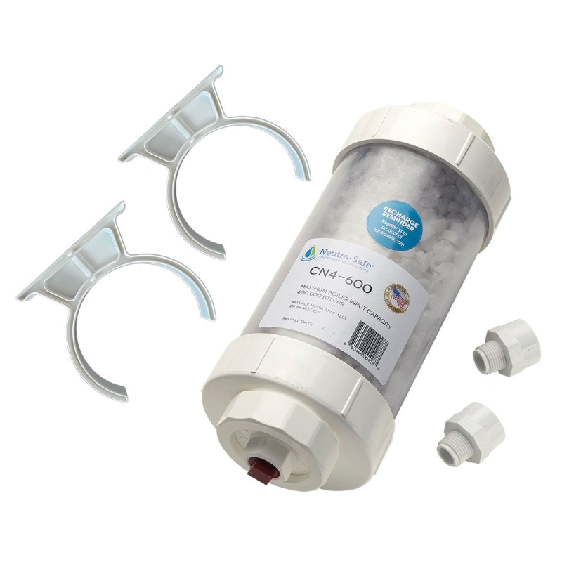 Neutra-Safe tube-style condensate neutralizers come in a range of six sizes from 220000 - 2 mbh/hr. The patented tube-style neutralizers feature integral unions with O-ring seals that greatly simplify removal for service and recharging. Unthreading a lock ring on either end of the unit allows the main body to be removed without disturbing the drain line. Replacement O-rings are included with tube style recharge kits and all 2 in tube-style neutralizers have snap-in mounting brackets.