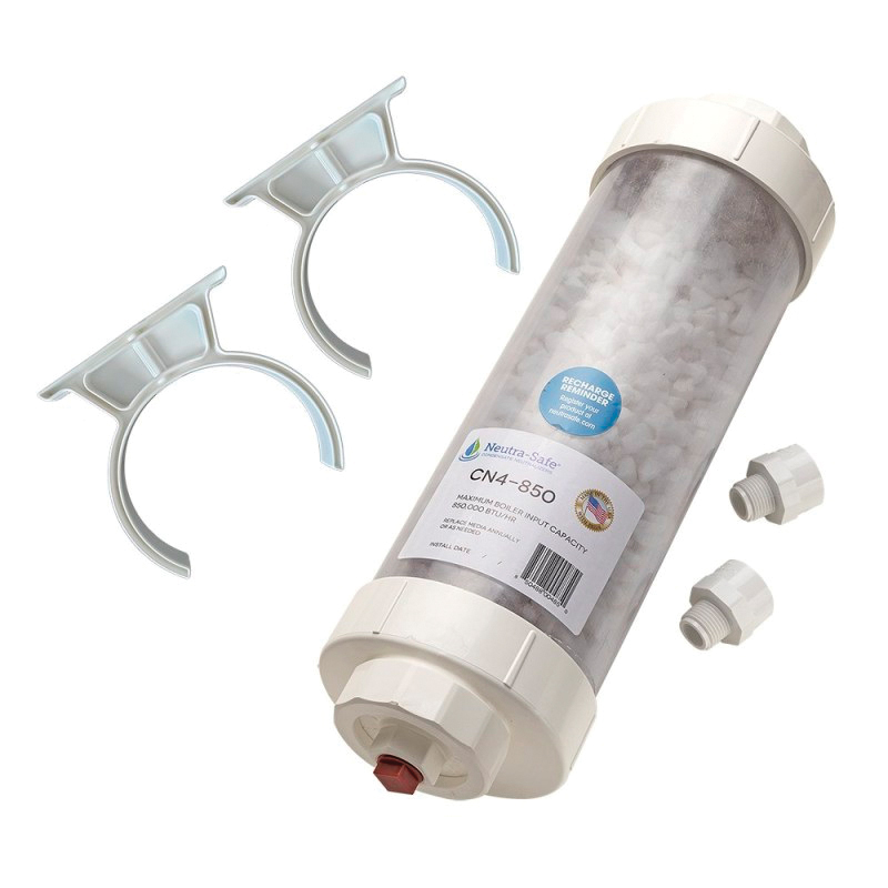 Neutra-Safe tube-style condensate neutralizers come in a range of six sizes from 220000 - 2 mbh/hr. The patented tube-style neutralizers feature integral unions with O-ring seals that greatly simplify removal for service and recharging. Unthreading a lock ring on either end of the unit allows the main body to be removed without disturbing the drain line. Replacement O-rings are included with tube style recharge kits and all 2 in tube-style neutralizers have snap-in mounting brackets.
