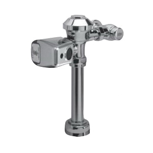 Exposed, quiet diaphragm-type, chrome-plated flushometer valve with a polished exterior. Complete with chloramine-resistant, dual seal diaphragm with a clog-resistant by-pass. The valve incorporates a 6 VDC motor actuator, a battery powered automatic sensor, high-impact-resistant polycarbonate housing and chrome-plated metal cover with manual override push-button and 10 deg angled sensor, high back pressure vacuum breaker, 1-piece hex coupling nut, adjustable tailpiece, spud coupling and flange for top spud connection.