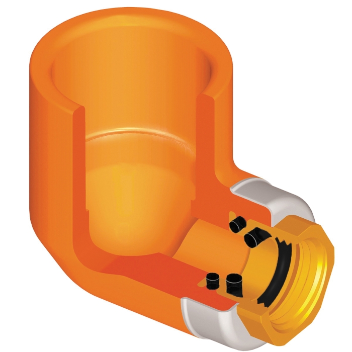 FlameGuard TorqueSafe SCH 40 and 80 Orange CPVC 90 deg Sprinkler Head Reducing Elbow with Gasket Sealed Brass Threaded Insert