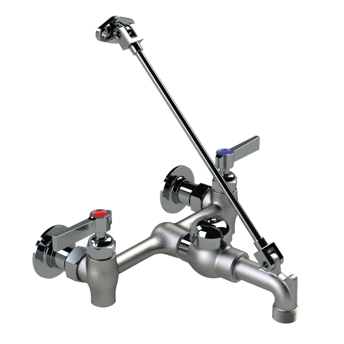 - Heavy-duty, chrome-plated brass 2-handles sink faucet with top reinforcing bar and pail hook on spout, vacuum breaker integral stops, chrome-plated hot and cold handles, 3/4 in hose end spout with pail hook, top reinforcing bar and mounting bracket