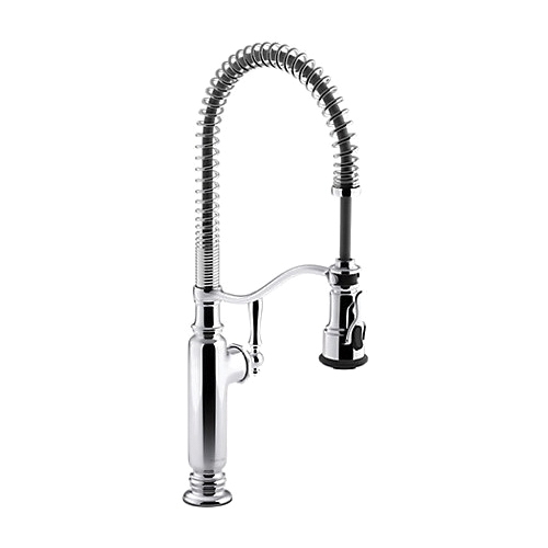 Designed with ambitious home chefs in mind, the Tournant faucet delivers elegant styling and professional performance to your kitchen. A unique three-function sprayhead lets you speed through a range of tasks - BerrySoft spray for food prep, an aerated stream for filling pots and pitchers and sweep spray for cleaning. The high-arching coil spring removes for easy cleaning.