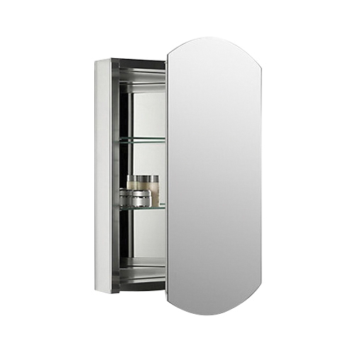 Sleek anodized aluminum and glass construction, the Archer medicine cabinet provides a stylish complement to your bath or powder room. Mirrors are positioned on the front and back of the door as well as the interior back wall of the cabinet. Two adjustable glass shelves hold your toiletries and bath items. Durable aluminum construction makes this cabinet rust and rot-resistant.