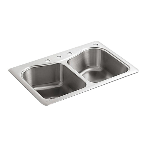 Staccato 18 ga Stainless Steel 4-Hole Double-Bowl Rectangular Top Mount Kitchen Sink, 33 in L x 22 in W x 8-5/16 in H