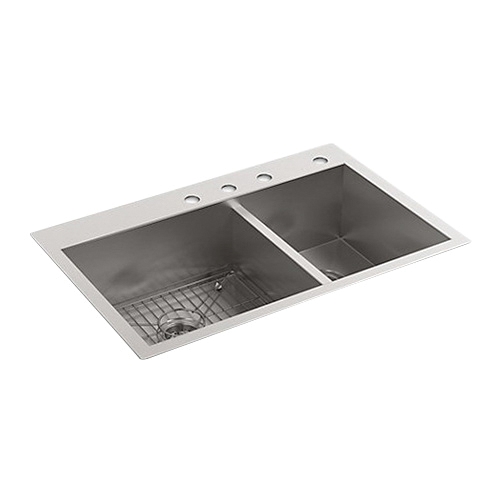 Vault 18 ga Stainless Steel 4-Hole Double-Bowl Offset Large/Medium Rectangular Top/Undermount Kitchen Sink, 33 in L x 22 in W x 9-5/16 in H, 4-11/16 in Water Depth