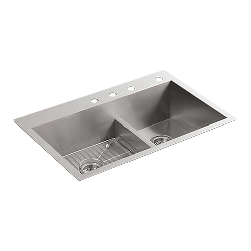 Vault 18 ga Stainless Steel 4-Hole Double-Bowl Offset Large/Medium Rectangular Top/Undermount Kitchen Sink, 33 in L x 22 in W x 9-5/16 in H