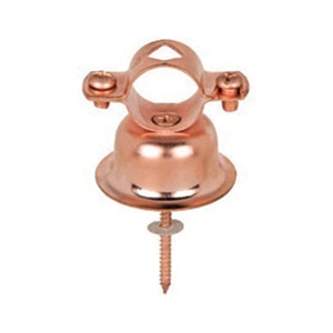 Sioux Chief 508 series copper-plated bell hangers shall be used where necessary to support copper CTS in piping systems. Hanger shall be fastened directly to studs, joists or walls and secured with 2-1/2 in mounting screw (provided). Bell hanger shall minimally provide a 3/4 in. stand off distance from mounting surface. Hanger shall be copper-plated. Upper and lower pipe saddles of hanger shall fit 1/2 in, 3/4 in or 1 in CTS tube after screws are tightened. Upper pipe saddle may or may not have void in strap for easier installation.