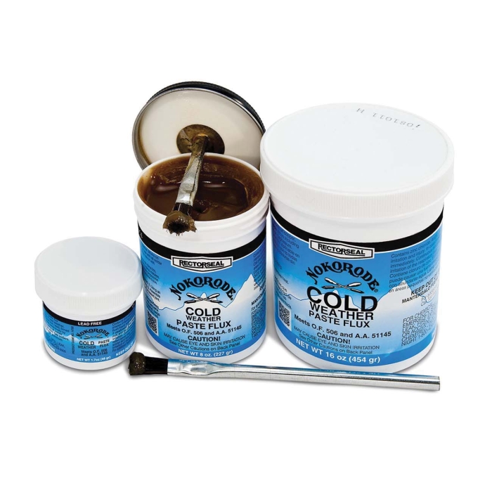 Nokorode cold weather flux is a lead-free, soft soldering paste flux especially formulated to stay soft and sticky in cold weather applications. It is ideal for use with 95/5 and other common solders. It cleans and fluxes the joint area all at one time. When heated, it reduces the surface tension in the joint and allows the solder to flow easily and uniformly into the joint. Nokorode cold weather flux works to deliver a strong, leak-free joint. It's non-aggressive formula is ideal for use on copper and brass fittings.