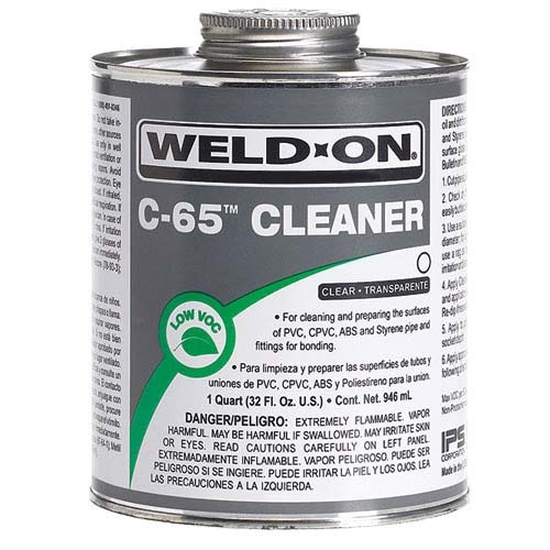 Weld-On C-65 is a clear, low VOC emission, water-thin, solvent cleaner. It is specifically formulated to remove grease, oil and dirt from the bonding surfaces of PVC, CPVC, ABS and Styrene pipe and fittings. It is approved for Flowguard Gold CTS plumbing systems.