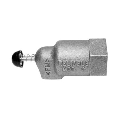 The model C mechanical ball drip valve is a listed trim component used in the alarm line of Reliable model A and D dry valves, Model DDX deluge and DDX preaction valves. The mechanical ball drip valve is designed to close upon activation of the dry or deluge valve when sufficient flow is present in the alarm line. In the normal or open position the mechanical ball drip allows for the relieving of pressure in the alarm chamber of the valve. After valve activation, push in the plunger of the mechanical ball drip valve to manually release the water pressure and to drain the alarm line of the valve.