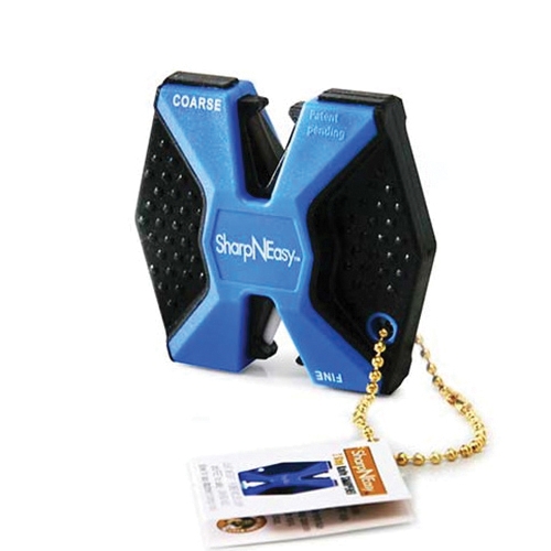 The SharpNEasy 2-Step Knife Sharpener is an innovative tool that everyone can use. The ceramic rods, dark for coarse and white for fine, are exactly what you need to care for and maintain your blades. The 2-stages allow for the proper angle every time by having 2-stationary ceramic rods molded into the base. The 2-Step Sharpener also has over-molded grips. The over-molding process allows the user to have a comfortable and secure grip while sharpening. The unit has a lanyard hole which allows for easy attachment to cord or string.