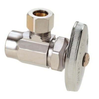 BrassCraft 1/2 in nominal sweat inlet x 3/8 in OD compression outlet multi-turn angle valve controls water flow to household plumbing fixtures - faucets, toilets, dishwashers, icemakers, washing machines, etc. The angle valve is most often used where the water pipe enters the room from the wall. With a few turns of the valve handle, you are able to stop the flow of water leading to the plumbing fixture, allowing for maintenance and repair without turning off water to the entire home.
