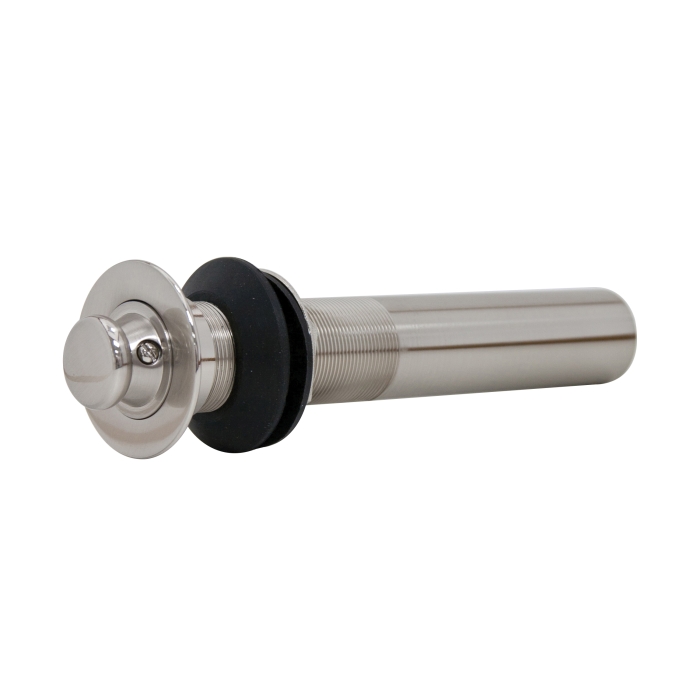 Lift and turn Lav drain without overflow holes brushed nickel. Fits 1-1/2 in drain openings. Threads measure 3-1/4 in from the flange and overall length is 7-1/2 in. The tailpiece is 1-1/4 in od. Not for use on sheet metal sinks, stainless steel or copper.