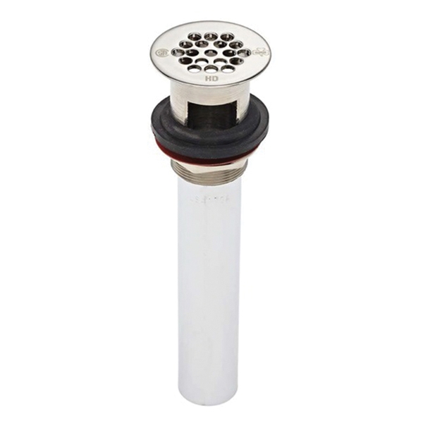 Cast brass heavy-duty finish chrome-plated open grid PO plug. Furnished with 17 ga 1-1/4 x 6 in seamless brass tailpiece, brass lock nut, heavy rubber basin washer and fiber friction washer.