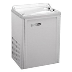 Wall-mount water cooler with easy-clean and anti-splash rim basin. Pushbutton activation with an exclusive Halsey Taylor Double Bubbler.