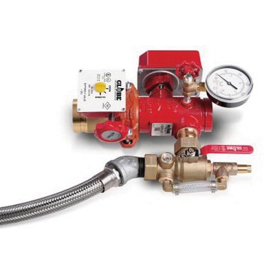 The Globe series "UM" universal manifold is a listed/approved manifold assembly incorporating a flow switch, test and drain valve, system pressure gauge and pressure relief valve. The UM may be ordered with or without an attached butterfly control valve. The UM is rated for a maximum working pressure of 300 psi. It has been engineered to incorporate the above mentioned components in a compact envelope. The test and drain valve contains a test orifice of K2.8 so that it may be utilized for flow testing any system with sprinklers having k-factors of 2.8 or larger. The UM is available in a variety of sizes and end connections to allow for cost effectiveness and ease of connections to check valves, control valves and piping. For sizes 3 in and smaller, an 18 in long stainless steel braided flexible hose is included with the UM for connecting the test and drain valve to a drain stack. The UM may be installed in the vertical (with flow upward) or horizontal orientation.