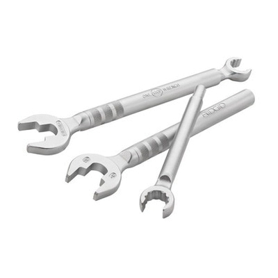 The one-stop wrench is a compound 2 in 1 tool that makes plumbing work easier than ever before. The open end provides both a 9/16 and a 15/16 in surface wrench, while the unique open box-end is designed for 3/8 in line nuts. The one-stop provides all the exact sizes you need to install angle stops and compression fittings.