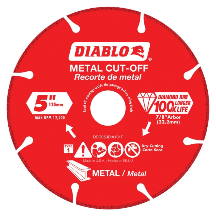 Diamond metal cut-off wheels deliver extreme durability, minimal downtime and increased productivity. These diamond rimmed wheels deliver 100X longer cutting life versus a standard bonded cut-off disc in some of the most intense metal cutting situations. The wheel's long lasting durability maximizes cutting even in extreme applications such as rebar, angle iron, cast iron and steel bar. DIABLO diamond metal cut-off wheels not only provide long lasting cutting life, durability and control, but they also allow for a safer cutting experience.