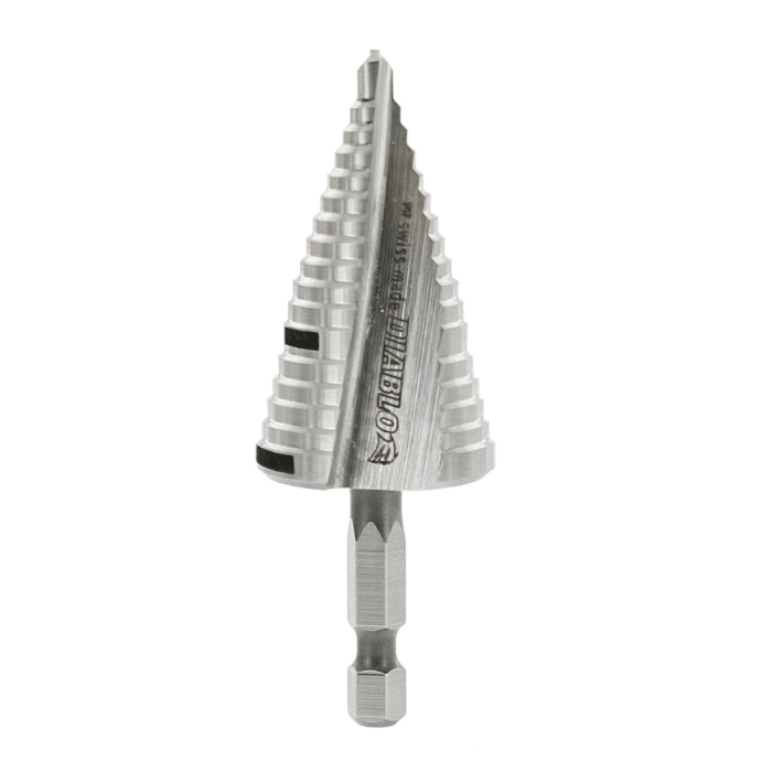 Diablo new step drill bits bring exclusive technology to the electrician, plumber and HVAC contractor with fast, accurate cuts and increased stability in thin metals, PVC other plastic materials. The innovative split-point tip design enables a fast, on-point start resulting in increased durability and up to 6X longer life. An automated precision grinding process on each step reduces wear and delivers 2X faster cuts. Multiple hole sizes are made easy with laser etched step markings while increased step heights for common hole sizes makes drilling holes more efficient and faster. Designed with a 1/4 in hex shank, these bits are impact ready and can be used with drills and impact drivers.
