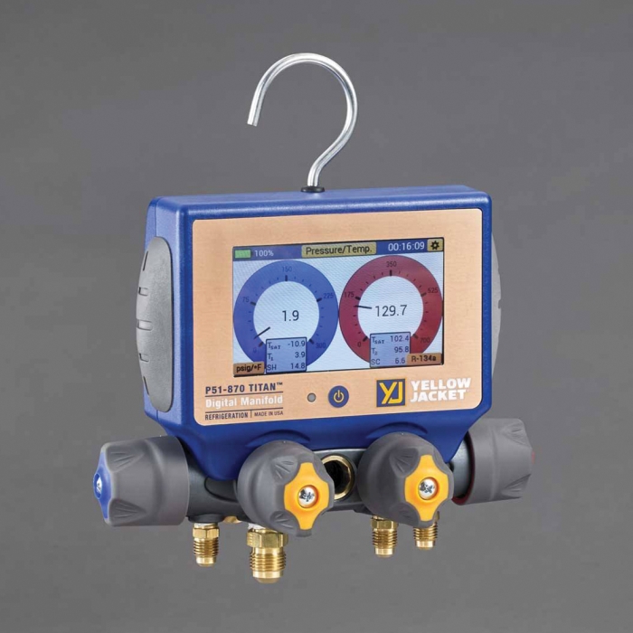 The yellow jacket P51 Titan digital manifold series provides ultimate system measurements with ease. This 4 valve manifold provides fast and accurate measurements for refrigeration and a/c systems. Measurements are displayed on a backlit digital display and can be transmitted via bluetooth to a Smartphone for even further analysis. Local display of system pressures and temperatures, superheat and subcool provide instant analysis. When connected to your Smartphone, target superheat and subcool are easily attained, along with all the other capabilities of the ManTooth app. The flagship Yellow Jacket P51-870 Titan features a 4.3 in full color touchscreen graphic display with digital and graphical representation of pressure and temperature measurements. It also features on-board data logging and standard vacuum sensor and measurements (vacuum sensor included). A 4 pack of hoses is included as well as two temperature clamps and a backpack carrying case for safe storage.