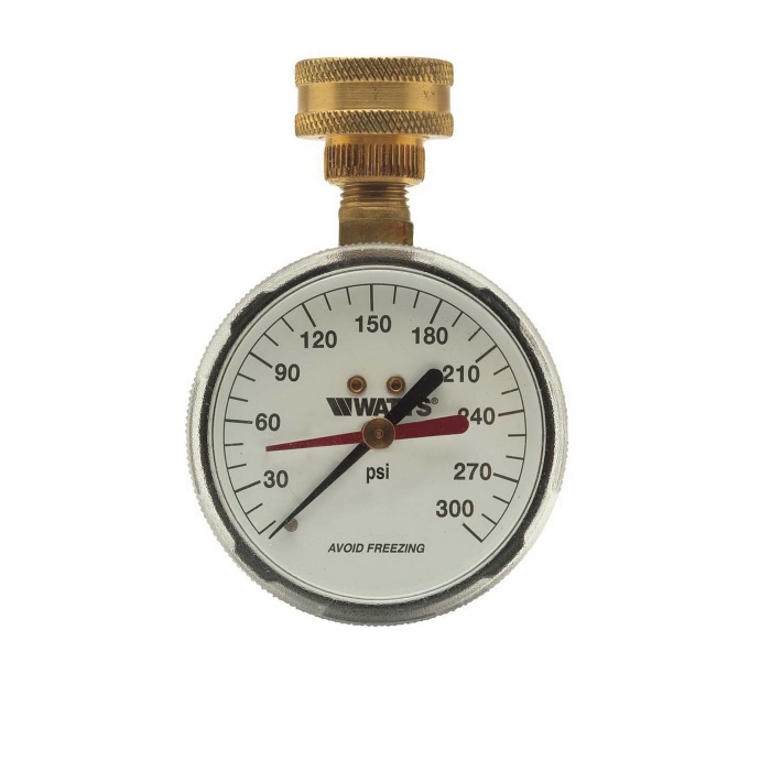 Series 276H300 Hose connection gauges are used to test water supply pressures within a distribution system. Its red indicator hand holds at the highest reading registered for detection of thermal expansion pressure surges. It features a black enamel steel case, Kostil polymer window, 3/4 in H.T. hose connection, and copper alloy bourdon tube sensing element. Accuracy is ASME, Type B. Available in 0 to 300 psi (21 bar) pressure rating scale.