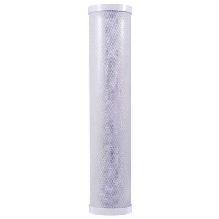 The 20 in full flow 5 nominal micron carbon block uses top of the line coconut shell housing. It is NSF standard 42 certified. This low cost carbon block filter outperforms granular activated carbon cartridges in chlorine reduction, lower pressure drop, lower cost and offers no water channeling. It offers a long-life of up to 40000 gal at 4 gpm flow rate.