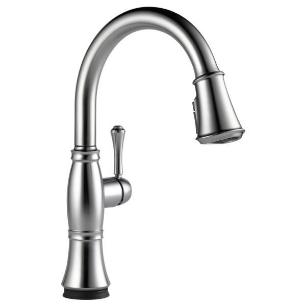 Touch it on. Touch it off. Whether you have two full hands or 10 messy fingers, Delta Touch2O Technology helps keep your faucet clean, even when your hands aren't. A simple touch anywhere on the spout or handle with your wrist or forearm activates the flow of water at the temperature where your handle is set. The Delta TempSense LED light changes color to alert you to the water's temperature and eliminate any possible surprises or discomfort. Delta MagnaTite Docking uses a powerful integrated magnet to pull your faucet spray wand precisely into place and hold it there so it stays docked when not in use. Delta ShieldSpray Technology cleans with laser-like precision while containing mess and splatter. A concentrated jet powers away stubborn messes while an innovative shield of water contains splatter and clears off the mess, so you can spend less time soaking, scrubbing and shirt swapping. Delta faucets with Diamond Seal Technology perform like new for life with a patented design which reduces leak points, is less hassle to install and lasts twice as long as the industry standard. Kitchen faucets with Touch-Clean spray holes allow you to easily wipe away calcium and lime build-up with the touch of a finger. You can install with confidence, knowing that Delta faucets are backed by our lifetime limited warranty.