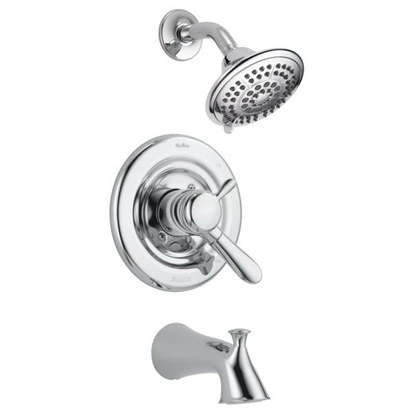 With separate handles for volume and temperature control, this Delta tub/shower provides a more refined showering experience. Simply set the water at your preferred temperature and turn the shower on or off with the volume control handle - without interrupting your set temperature. Delta pressure-balance valves use Monitor technology to protect you and your family from sudden temperature changes. The pause setting gives you ample space for shaving, lathering and other shower tasks, then easily restarts the water with the temperature where you left off. This spray setting helps you conserve water, so you can worry less about depleting your supply of hot water - and you help the environment too. While other products may gather unsightly mineral build-up over time, Delta soft rubber Touch-Clean spray holes allow any mineral residue to simply be wiped away for an instantly refreshed look - with no need for soaking or the aid of chemical cleaners.